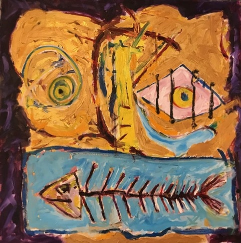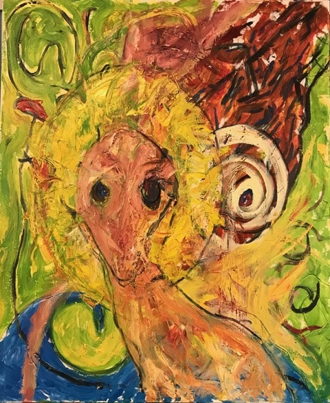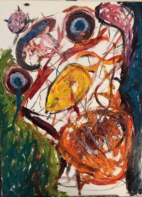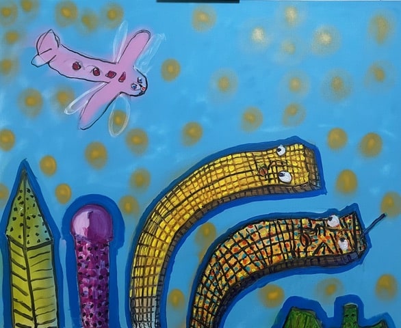En général, je travaille sans penser à un sujet précis. Je trace quelques lignes ou applique des couleurs qui en amènent d’autres jusqu’à ce qu’une image émerge et s’impose. C’est un moment très important pour moi car j’ai le sentiment que la toile a son propre ADN et que je ne dois pas interférer mais seulement l’accompagner dans sa mise au monde.