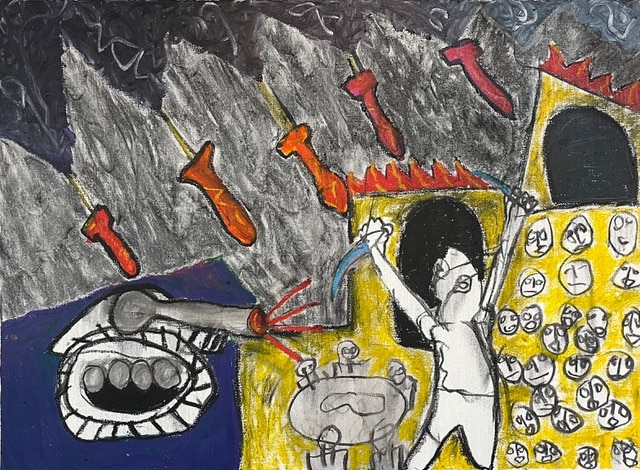 Je détourne la réalité et la douleur inhérente à cette réalité dans un processus de réécriture colorée et ludique. Je suis très sensible a la bizarrerie du monde et je transmets son étrangeté. Ce n’est que quand la toile est terminée que je comprends son sens. Je me rends compte que j’ai transformé le tragique en absurde. Comme Philip Guston, je suis content quand je suis déconcerté par le résultat.